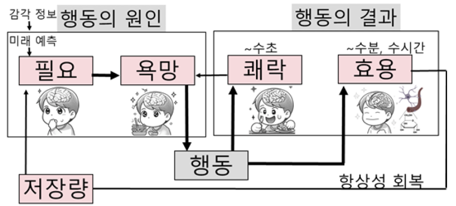 이런 이론들을 바탕으로 필자가 정리해 보면, 아래 형태로 필요, 욕구, 쾌락, 효용으로 행동의 원인과 결과를 그려볼 수 있었다 (2024 BioEssays).
