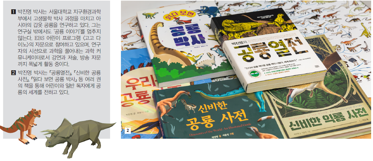어렸을 때부터 공룡을 너무 좋아해 ‘공룡이 되는 게 꿈이었다’는 박진영 박사. 초등학생 시절부터 외국 사이트에 들어가 새로운 공룡 정보를 찾아보거나, 화석을 좋아하는 사람들과 온라인 커뮤니티에서 정보를 주고받을 만큼 공룡에 몰두했다. 고등학생이 되어 진로를 고민하던 그는 부모님이 사준 책 한 구절에서 답을 찾았다.