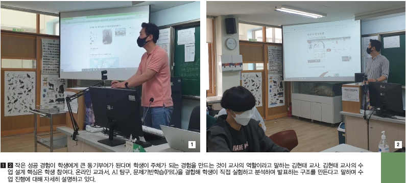 또한 역노화 프로젝트에서는 실험과 문헌 탐구를 결합해 생활 속 건강 관리와 과학적 원리를 연결한다. AI 식물도감 제작 수업에서는 고3 학생들이 교실 밖으로 나가 주변 식물을 촬영하고 AI에 학습시켜 식물도감을 제작했다. 김 교사는 수능 준비로 지친 학생들이 교실 밖으로 나가 실험하고 학습 결과를 공유하며 웃는 모습을 볼 때 큰 보람을 느낍니다. 학생들은 ‘대학교 수업 같다며 즐거워했다고 회상했다.