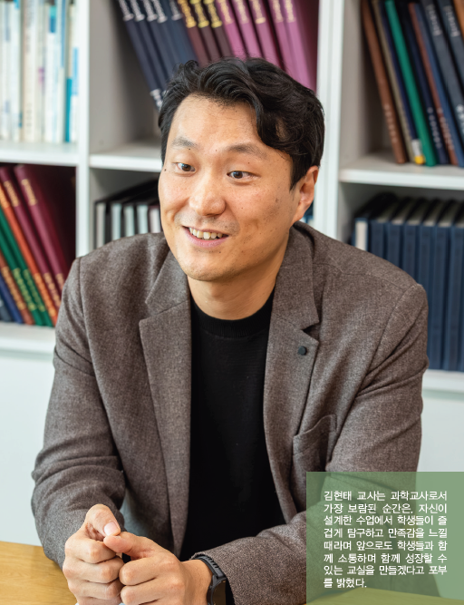 김 교사에게 과학교사로서 가장 보람된 순간은, 자신이 설계한 수업에서 학생들이 즐겁게 탐구하고 만족감을 느낄 때다. 수업 만족도 설문조사에서 학생들의 주관식 평가를 읽으며 보람과 위로를 동시에 얻는다.