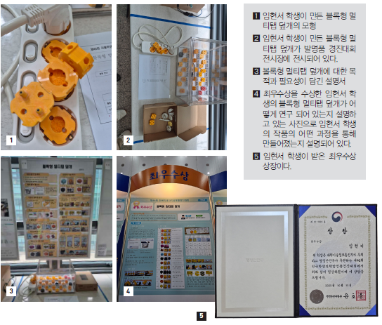 이 질문은 곧 발명으로 이어졌다. 서로 끼워서 보관할 수 있는 ‘블록형 멀티탭 덮개’라는 아이디어가 탄생한 것이다. 현서 학생은 3D 프린터로 여러 형태의 시제품을 제작하며 크기 조절, 끼워지는 각도, 내구성 등을 세밀하게 조정했다. 처음 몇 번의 출력에서는 규격이 맞지 않아 조립이 되지 않거나, 강도가 약해 쉽게 파손되는 문제 등이 발생했다. 그러나 실험 과정에서 오류가 생길 때마다 원인을 분석해 설계를 다시 수정하고, 출력 조건을 바꾸어가며 수십 차례 시도를 이어갔다. 그 과정에서 3D 설계 프로그램 활용 능력뿐 아니라 소재의 특성과 구조적 안정성까지 공부하게 되었고, 무엇보다 ‘실패를 두려워하지 않고 다시 시도하는 태도’를 스스로 체득했다.