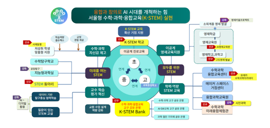 서울형 K-STEM의 구조는 크게 네 가지 축으로 구성된다. 수학과학융합교육센터 구축, K-STEM Bank 기반의 공유·협력 시스템, 지능형 과학실·개방형 실험실 확충, 교원 전문성 강화와 산학연 연계 프로그램이다. 이러한 체계는 교사의 자율적 수업 설계와 학생의 주도적 탐구 경험을 연결하는 ‘교육 생태계형 정책’으로 추진하고 있다.